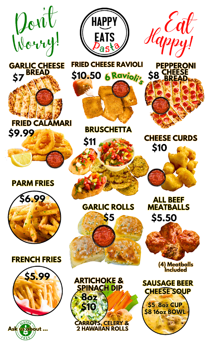 The menu at HAPPY EATS PASTA is a delightful ode to traditional Italian flavors, with highlights that are sure to tantalize your taste buds. Customers rave about the fried ravioli, which have become a crowd favorite. The authentic homemade sauces—such as the habanero ghost pepper and chipotle—are not to be missed, adding a twist of excitement to the familiar pasta offerings. The culinary team pays homage to family recipes that evoke nostalgia and genuine comfort, making the experience even more special.