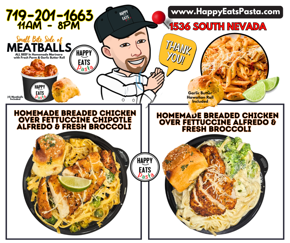 HAPPY EATS PASTA, nestled in the heart of Colorado Springs, is a delightful family-owned gem that offers a taste of Italy with a warm, inviting atmosphere. Guests rave about the homemade dishes, including the crowd-favorite fried ravioli and tantalizing meatball sliders, showcasing a commitment to authentic flavors. The owners' genuine hospitality creates a community feel, making each visit memorable. With charming decor and an attentive staff, it’s a place where diners instantly feel at home. Whether you're craving bold sauces like habanero ghost pepper or simply seeking comfort food, HAPPY EATS PASTA delivers a dining experience that leaves you wanting more.